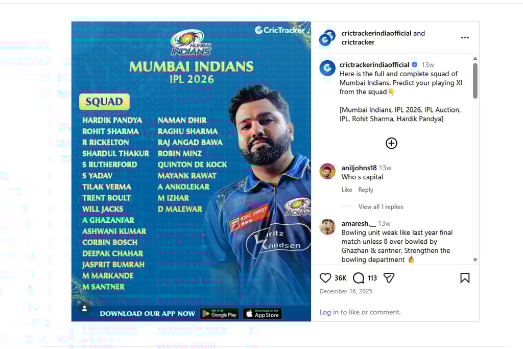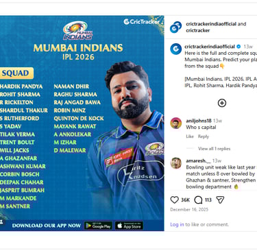Mumbai Indians look like a well-balanced and experienced side in IPL 2026. With a powerful batting lineup, lethal bowling attack, and strong leadership, they are strong contenders for their 6th IPL title.